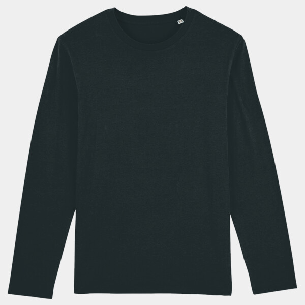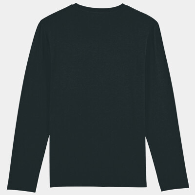 Set-in sleeve. 1x1 rib at neck collar. Inside back neck tape in self-fabric. Sleeve hem and bottom hem with wide double topstitch. Men's, medium fit, long sleeve, round-neck. 100% organic ringspun combed cotton. Single Jersey. Fabric washed. Vegan certified. Fairwear Foundation certified. Oeko-Tex certified.